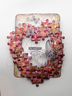OK, now that my jaw is back in it's proper place, I would like to say this is WONDERFUL use of those puzzle pieces! (I knew I was saving some pieces for something fun to make!) Your background is equally impressive! Pinned this one! I am delighted you shared your artwork with us at Frilly and Funkie! Hugs! Sara Emily