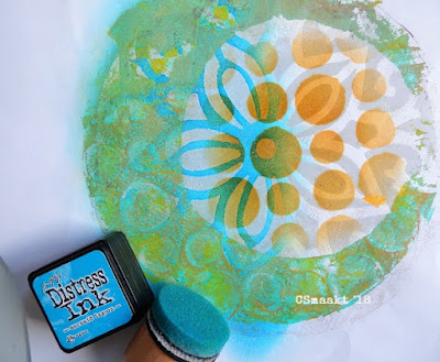 I took a Gelli printed paper and did the technique with a stencil and Versamark ink. Heat embossed it with -clear- embossing powder.
