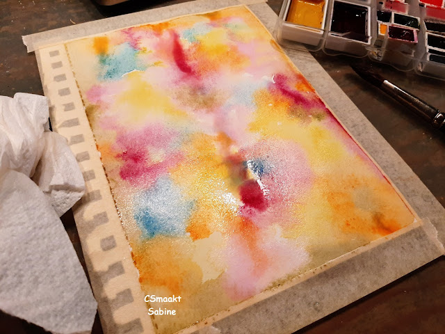 Op een aquarelpapier eerst kleur aangebracht. Daarop met potlood de bloemen uit de losse hand getekend en ingekleurd met de zelfde aquarelverf waar de ondergrond mee is gekleurd.